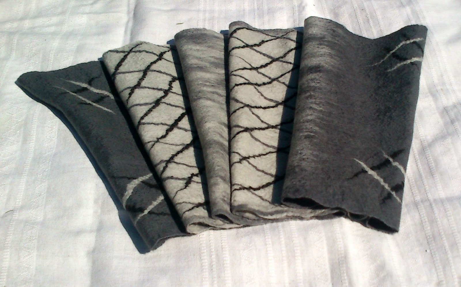 c.d. mojego filcowania, ponieważ szali w kwiatki wzorki różowych czerwonych, w maki i tym podobne jest zatrzęsienie,postanowiłam wykonać kilka szaliczków które mogą nosić panowie...,